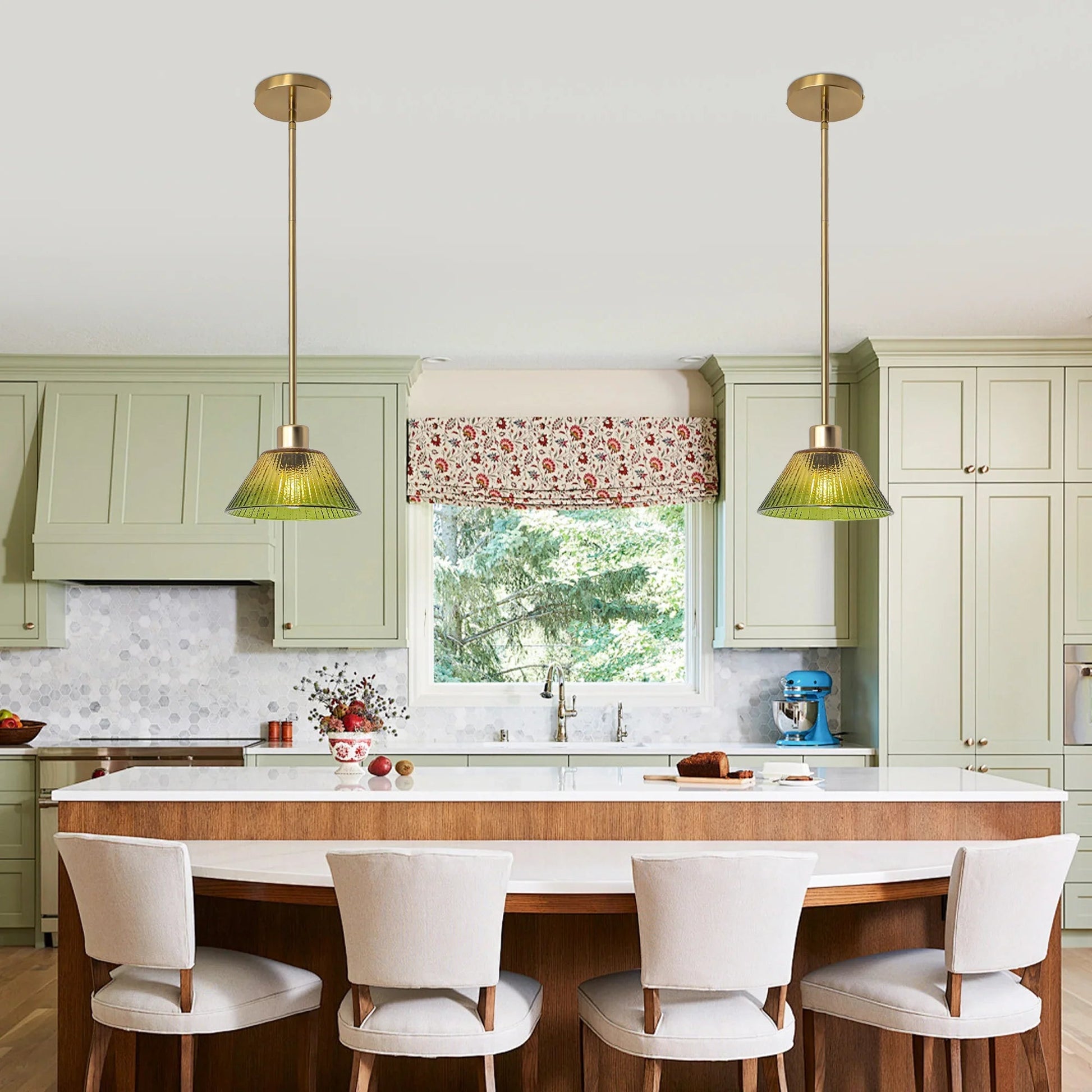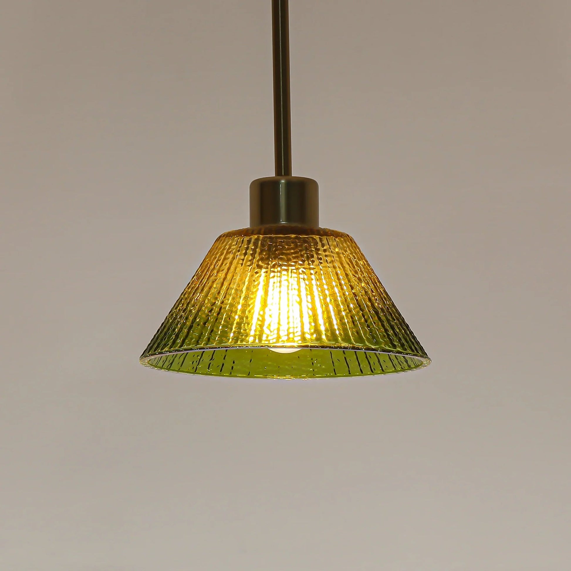 Textured glass shade in a charming yellow-green gradient casts a warm, inviting light, ideal for dining areas, kitchen islands, or cozy reading nooks. -