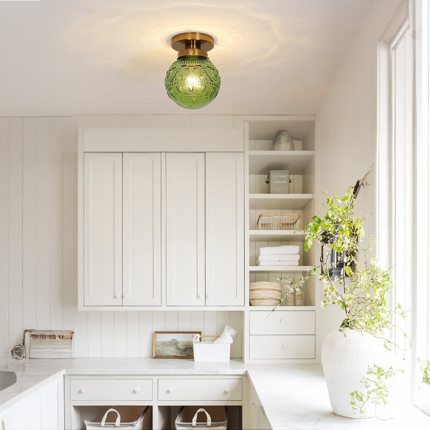 Vintage Brass Flush Mount Ceiling Light with Green Embossed Glass Globe